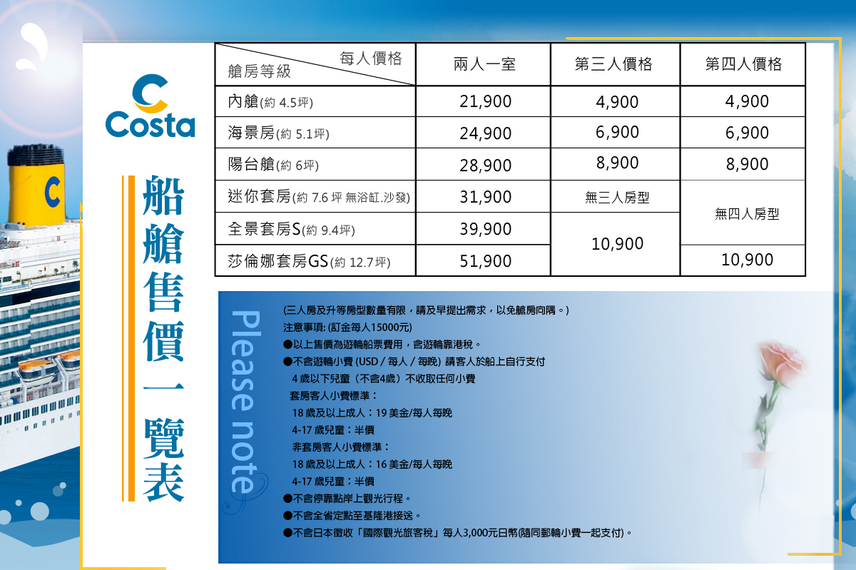 房另有價格計算方式。若沒有上岸觀光,在船上我要做什麼! 在海上航行時,您將感覺比其他的旅遊方式都更加自由而且多彩多姿!