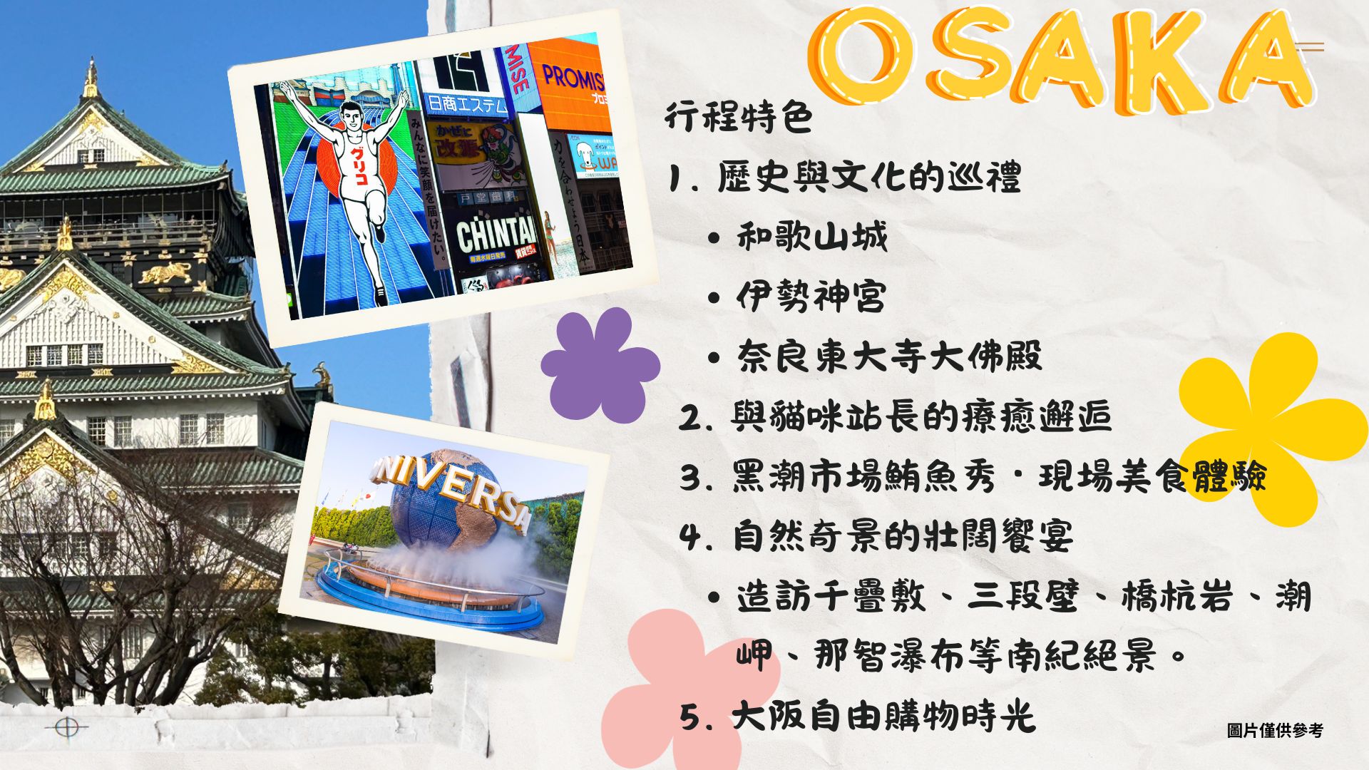 1.導遊、司機小費(建議每天約台幣 NT300元 / 人)五天合計:NTD 1,500 2.行程表上未表明之各項開支,自選建議行程交通及應付費用。 3.個人新辦護照費用。 4.旅遊平安保險及旅遊不便險。 5.旅行社投保之責任保險,僅理賠「因意外事故所導致體傷之醫療費用」,如因自身疾病所致,就醫治療所產生的醫療費用是不包含在旅行社責任保險理賠項目內的(如:感冒、癌症、心臟疾病、洗腎、高血壓、糖尿病、氣喘病...等)。建議您可另自費加保海外旅行綜合保險所附加的意外醫療及海外突發疾病醫療險,並請務必隨身攜帶個人習慣性用藥,如感冒藥、胃腸藥、心臟病藥、糖尿病藥、高血壓藥等私人藥物,以及醫師開立的處方籤。 6.純係私人之消費:如行李超重費、飲料及酒類、洗衣、電話、電報、私人交通費、行程外陪同購物之報酬、自由活動費、個人傷病醫療費、宜自行給與提供個人服務者(如旅館客房服務人員)之小費或尋回遺失物費用及報酬。 7.若有需要全程入住單人房,請洽業務確認加價費用。也無自然單人房,若為一大人或一大人加一嬰兒參加,請洽業務確認加價費用。日本房型除和式房外,皆為兩張小床,一大床房型需請洽業務確認加價費用。日本房型除和式房外,少有三人房型,三人房型為(A.)一大床+一活動式單人床 (B.)二小床+一活動式單人床 (C.)一大床+一活動式單人床,需請洽業務確認加價費用。 9.一經確認後如個人因素取消或被拒絕入境日本,將無法申請退費。